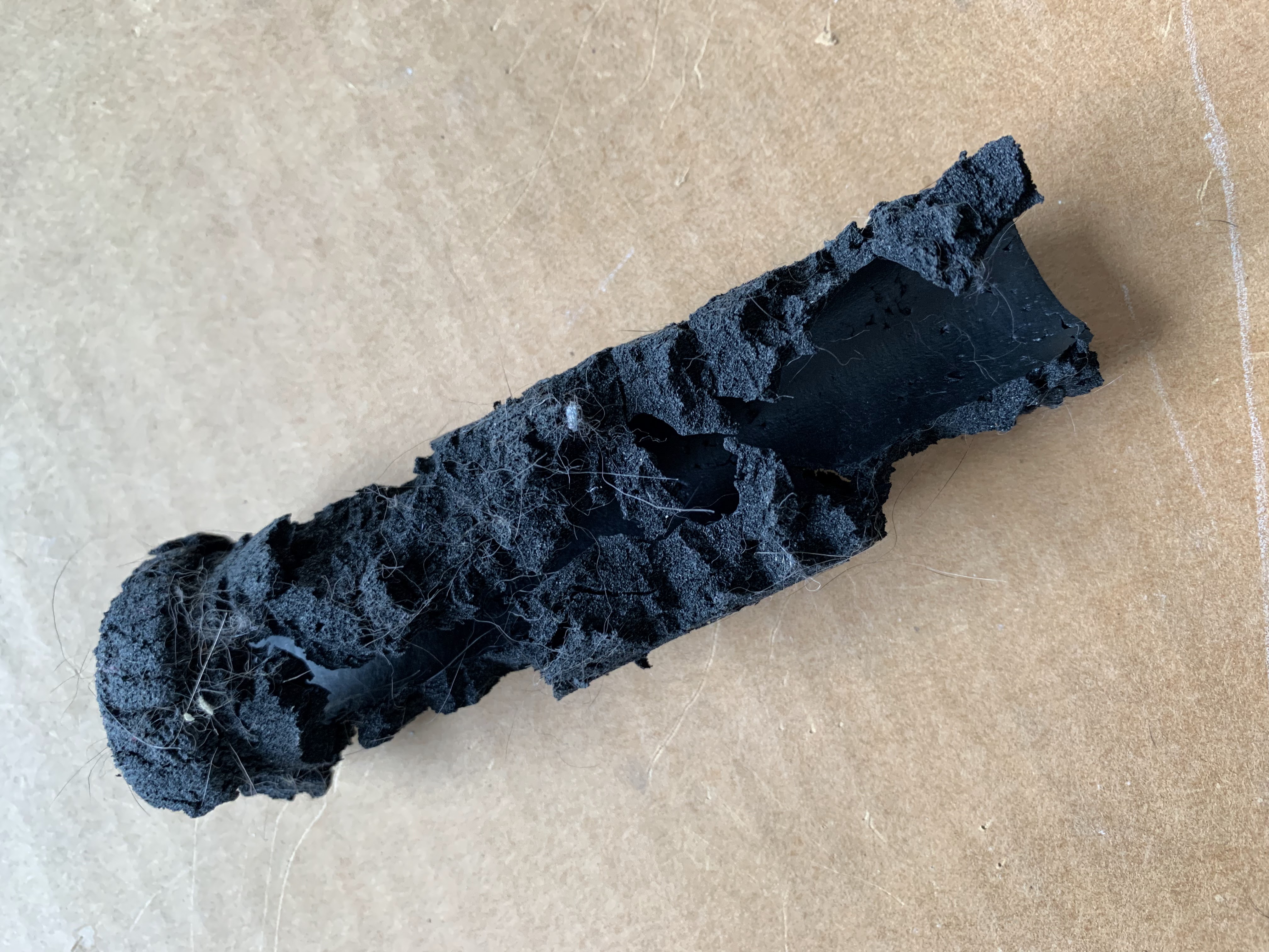 | Evidence: Rubber hand grip chewed and left to die a slow death on the floor. |