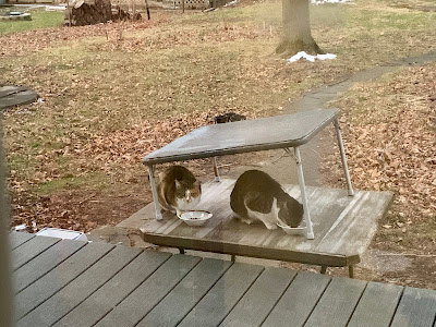 None are showing up with any kind of regularity, so I replace the water every morning, but don't put out food unless I see a cat nearby.
