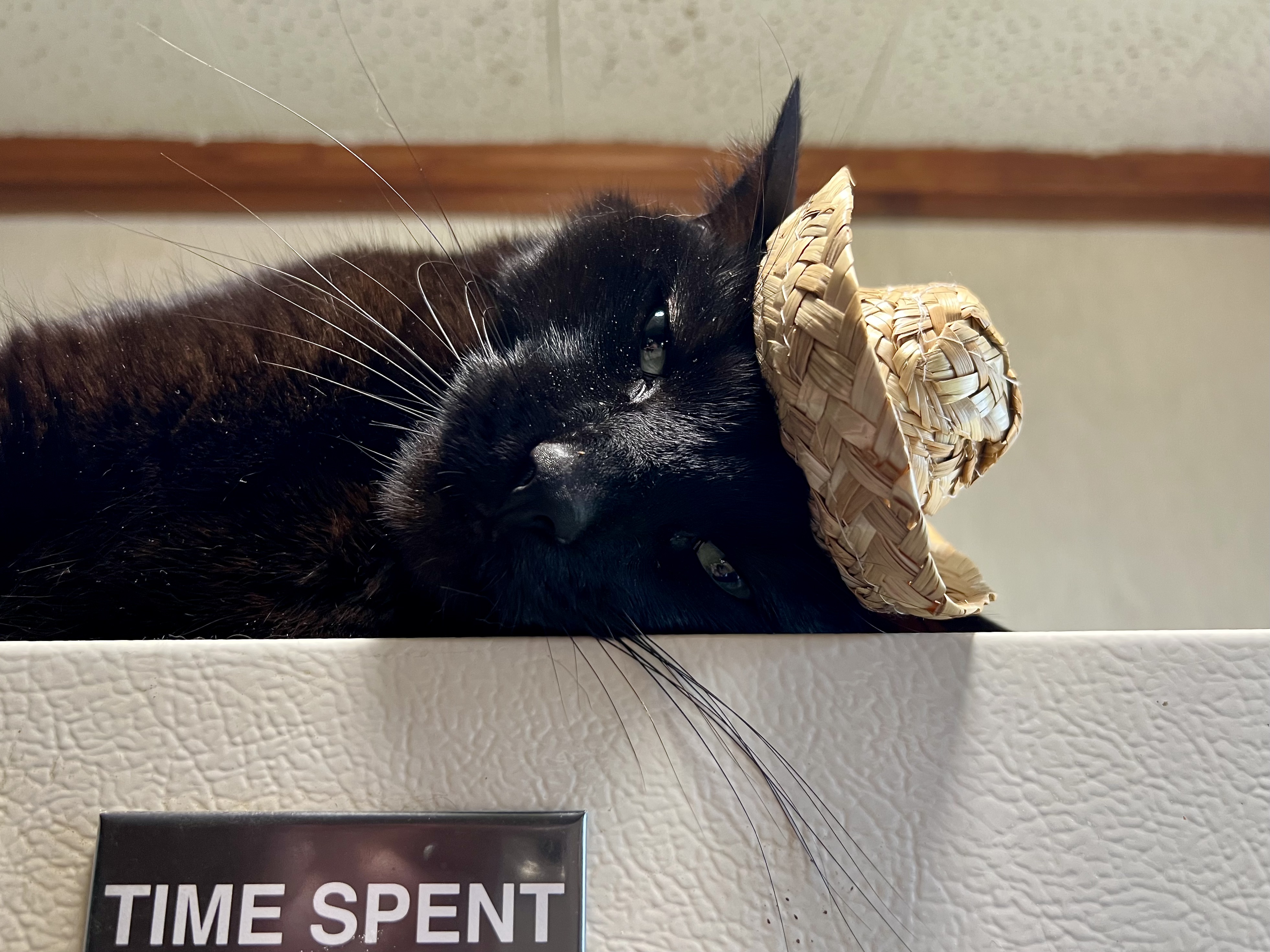 | As it's not a crown or tiara, Sweetie remains unimpressed with a humble straw hat. Almost looks like a backward baseball cap; she's earned her street cred. |
